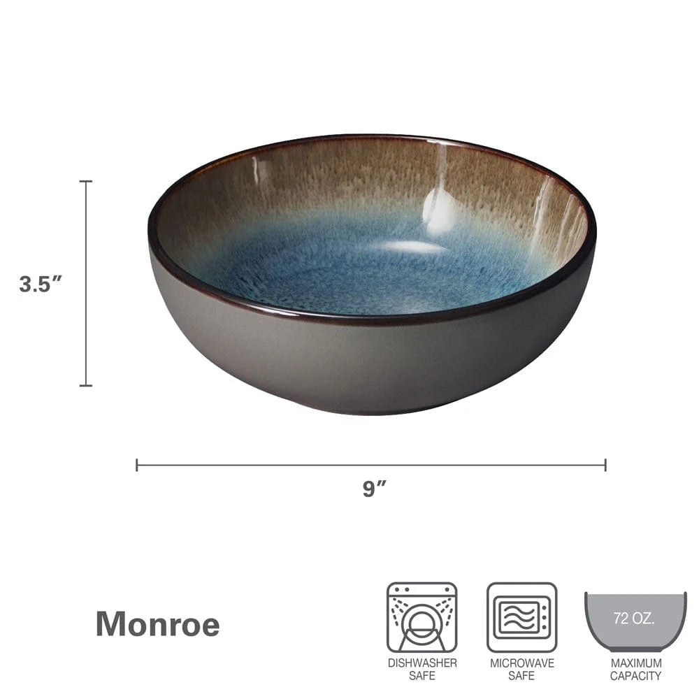 This Monroe Blue Vegetable Serve Bowl features an eye-catching speckled blue effect in the center, a natural line design circling the rim, and a deep, dark band framing the edge, with a reactive glaze finish. Due to the nature and hand-crafted qualities of reactive glaze, no two pieces are exactly alike and will exhibit unique variations in color and pattern. Product may slightly differ from image shown.
