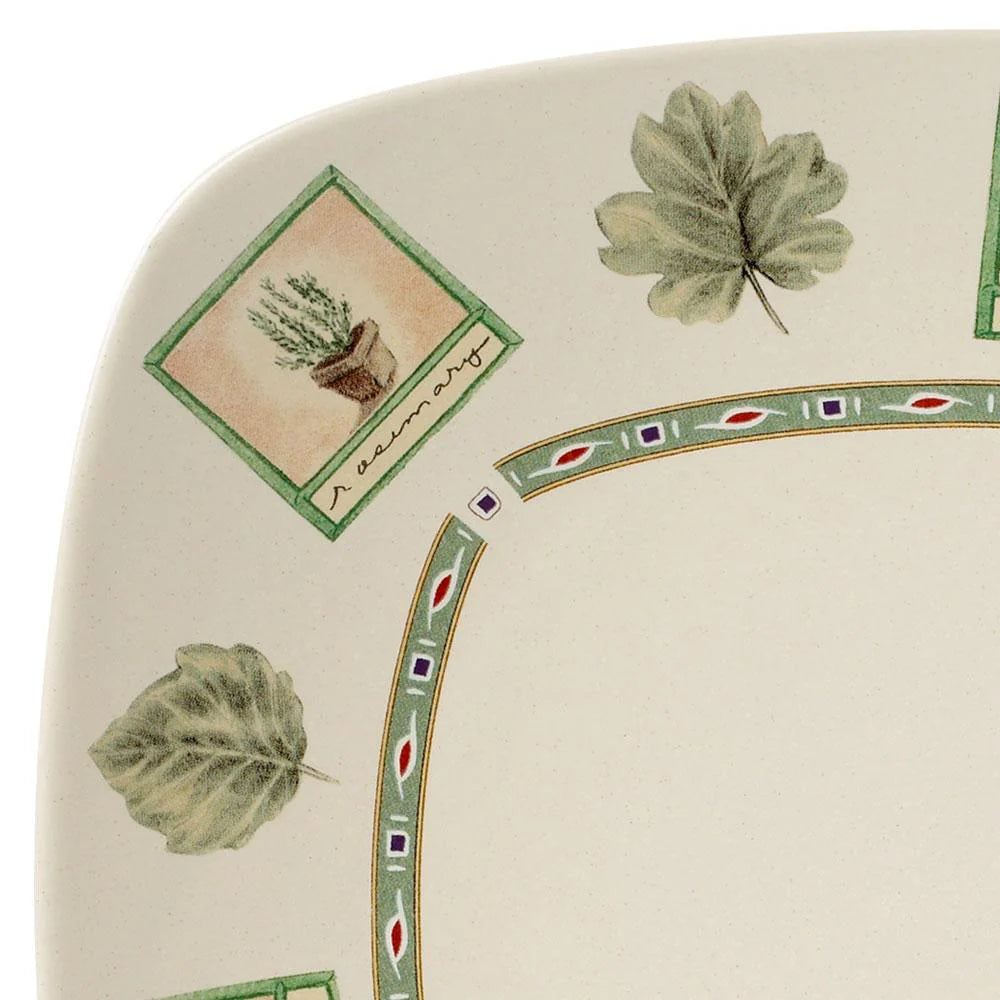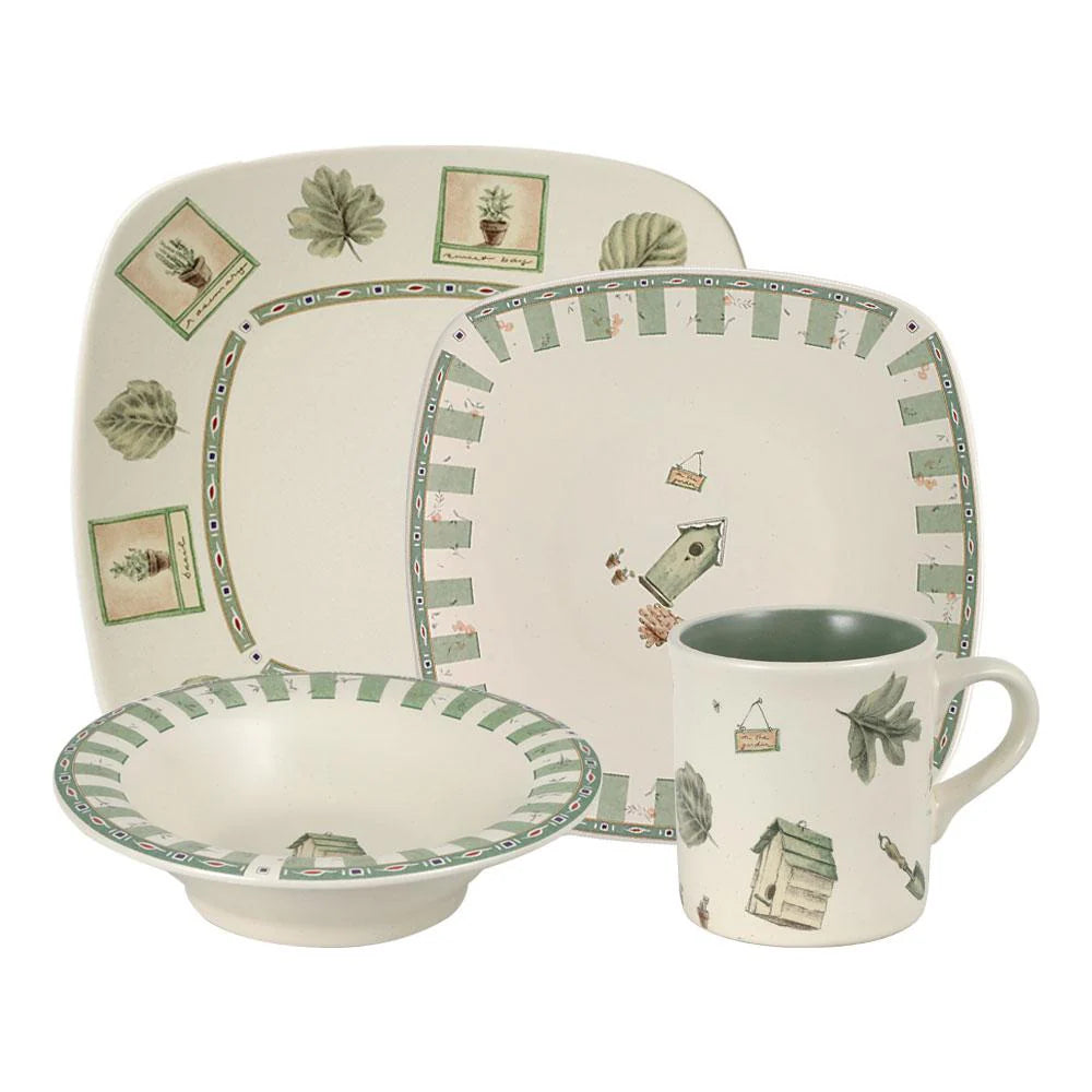 Refresh your table setting with square dinnerware! This square set is a nice departure from conventional round dinnerware, or you can mix and match the two. The square pieces have rounded corners, so the two different shapes actually complement each other. So be hip and set a square table. Crafted of stoneware. Each service includes: 10 inch square dinner plate, 8-1/4 inch square salad plate, 7-1/4 inch diameter (10 ounce) soup cereal bowl and 12 ounce coffee mug. Microwave and dishwasher safe.