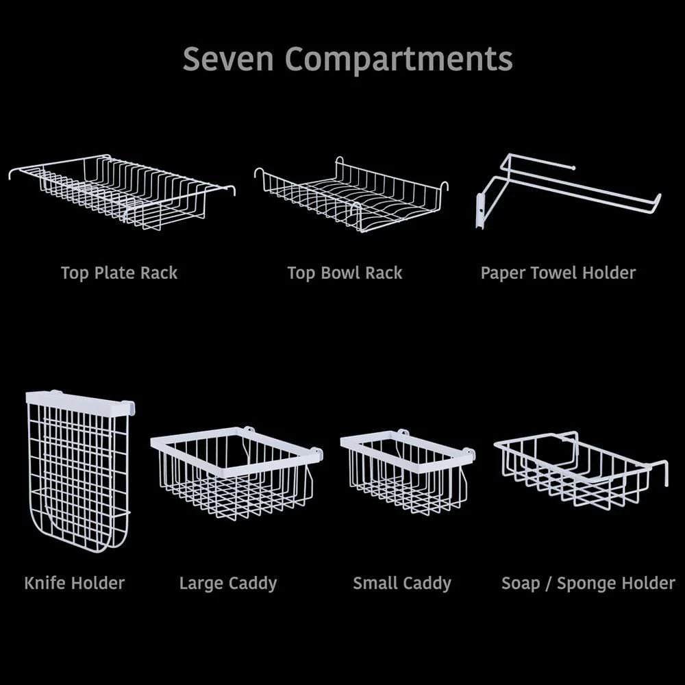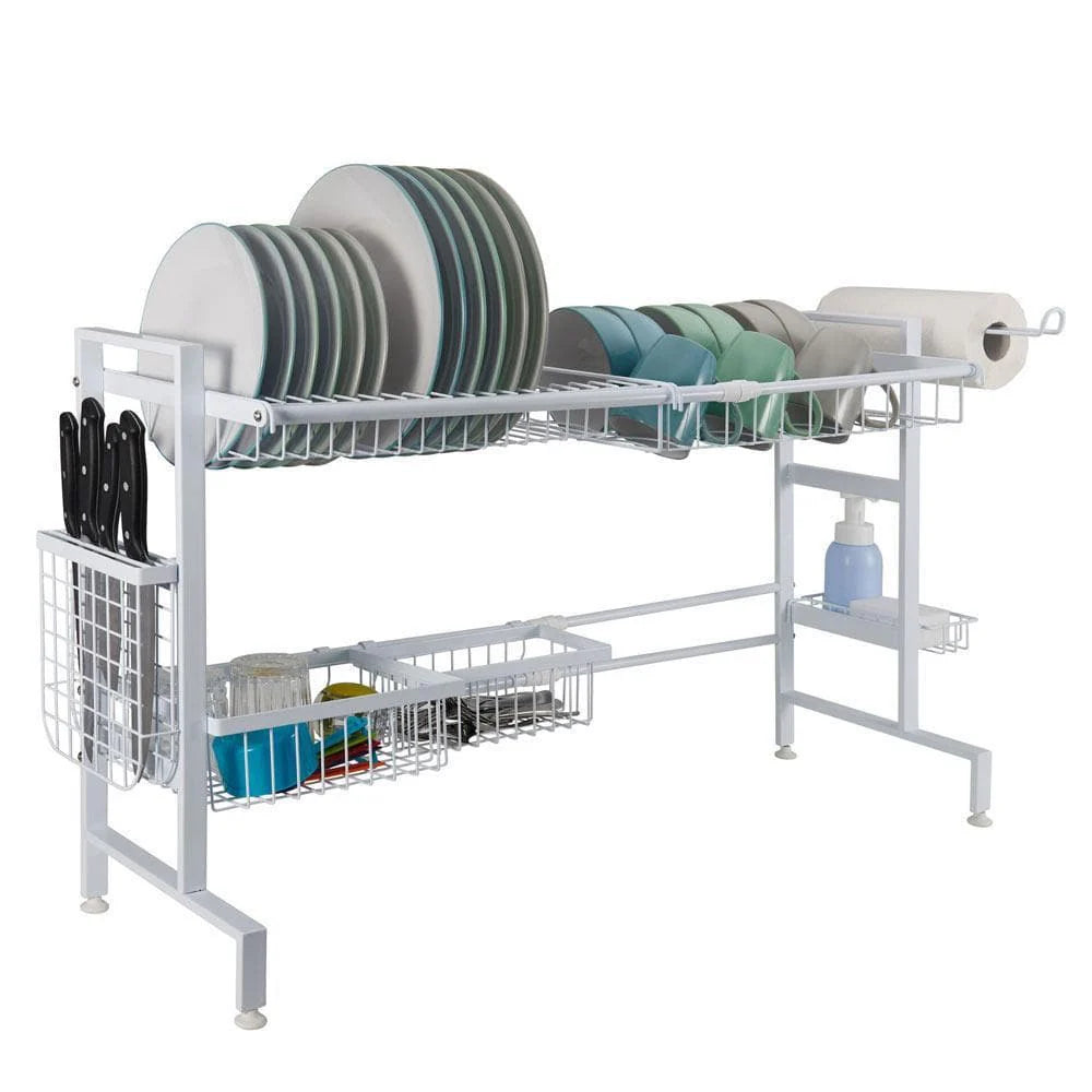 This Gourmet Basics Expandable White Dish Rack Organizer features 2-tiers of numerous wire frame baskets, hooks, and a built-in paper towel holder. All, the baskets are removable so you can expand or shrink the size of the organizer to suit your needs. Whether you need space to drip-dry dishes and utensils over the sink, or storage for cleaning products in a larger cabinet, this unique organizer will hold your items and keep them in their own space.
