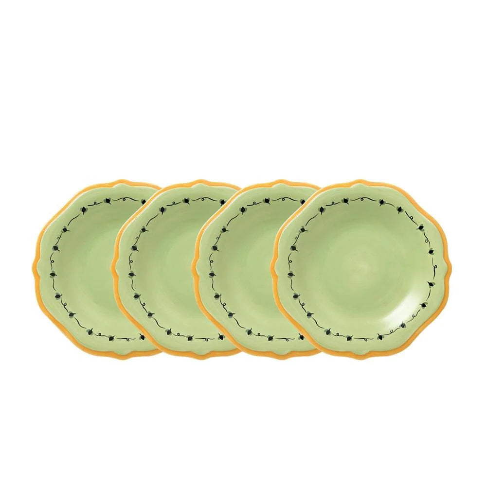 This could also be known as the 'bread' plate, 'dessert' plate, 'piece of fruit' plate, or the 'sneaking a snack' plate. Constructed of stoneware. Microwave and dishwasher safe. Set of 4 salad plates with yellow band, each measures 9 inch diameter.