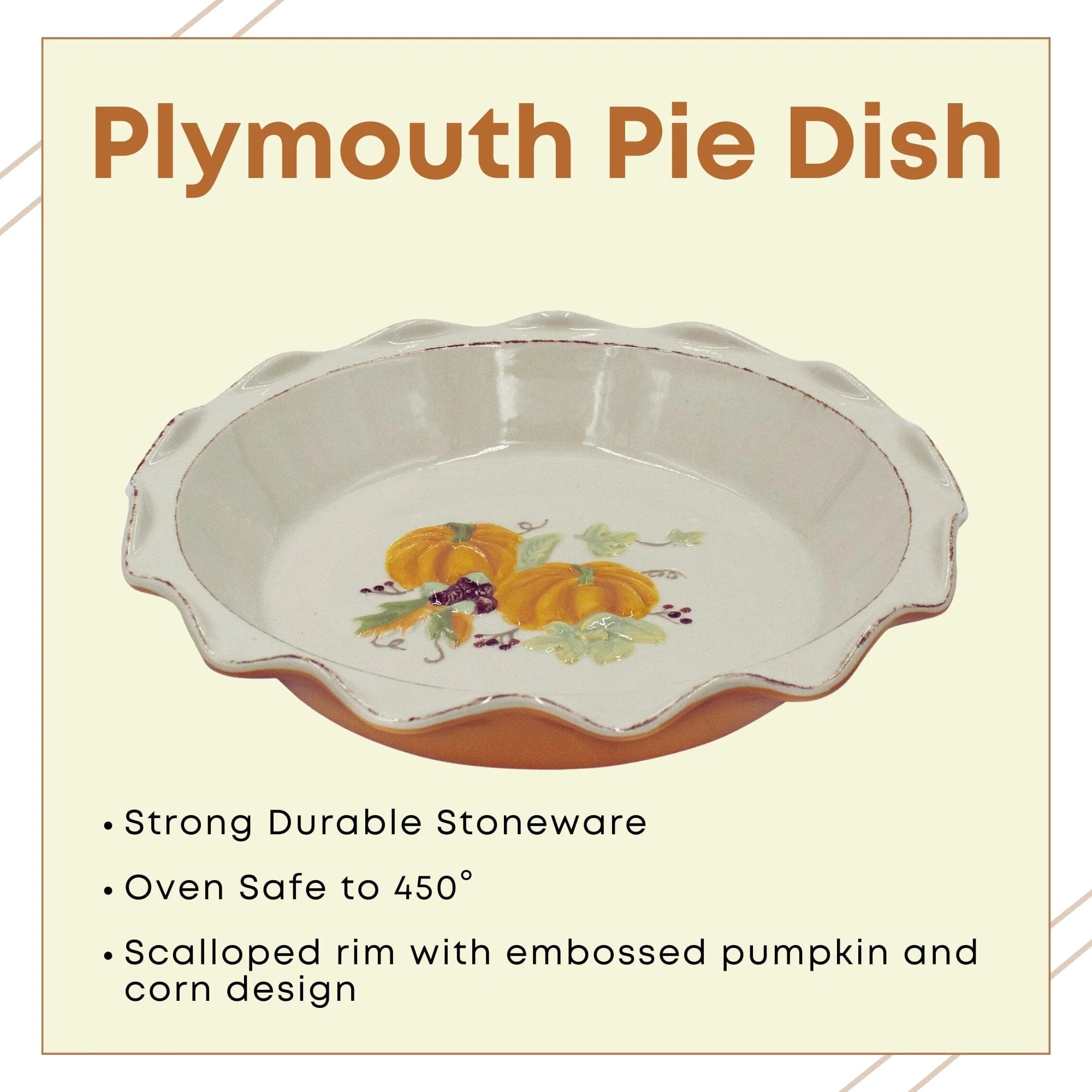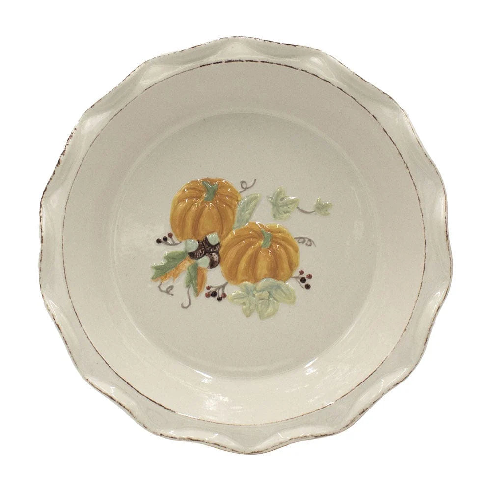 This Plymouth Pie Plate features and scalloped rim with an embossed pumpkin design in the center, and will bring the feeling of the Fall season to any table.