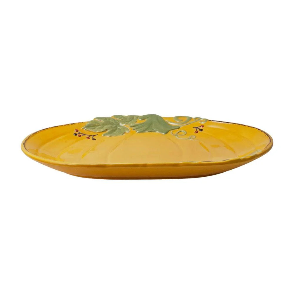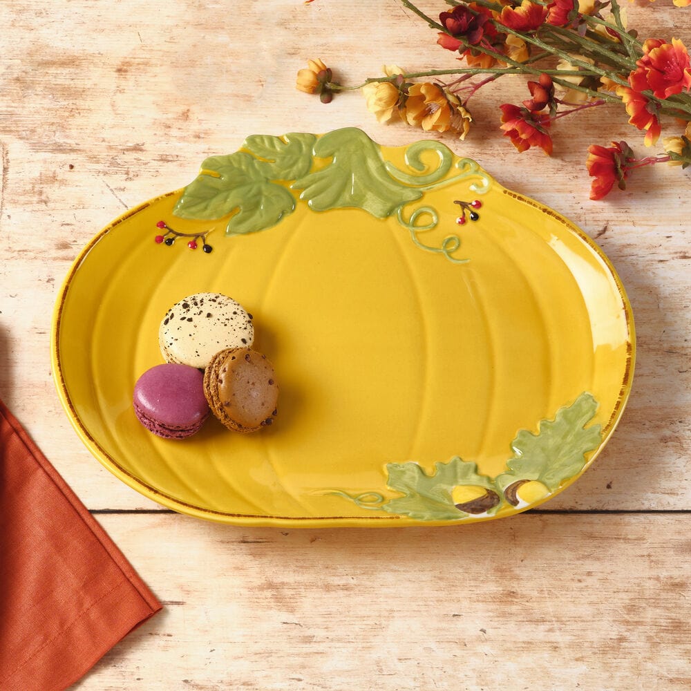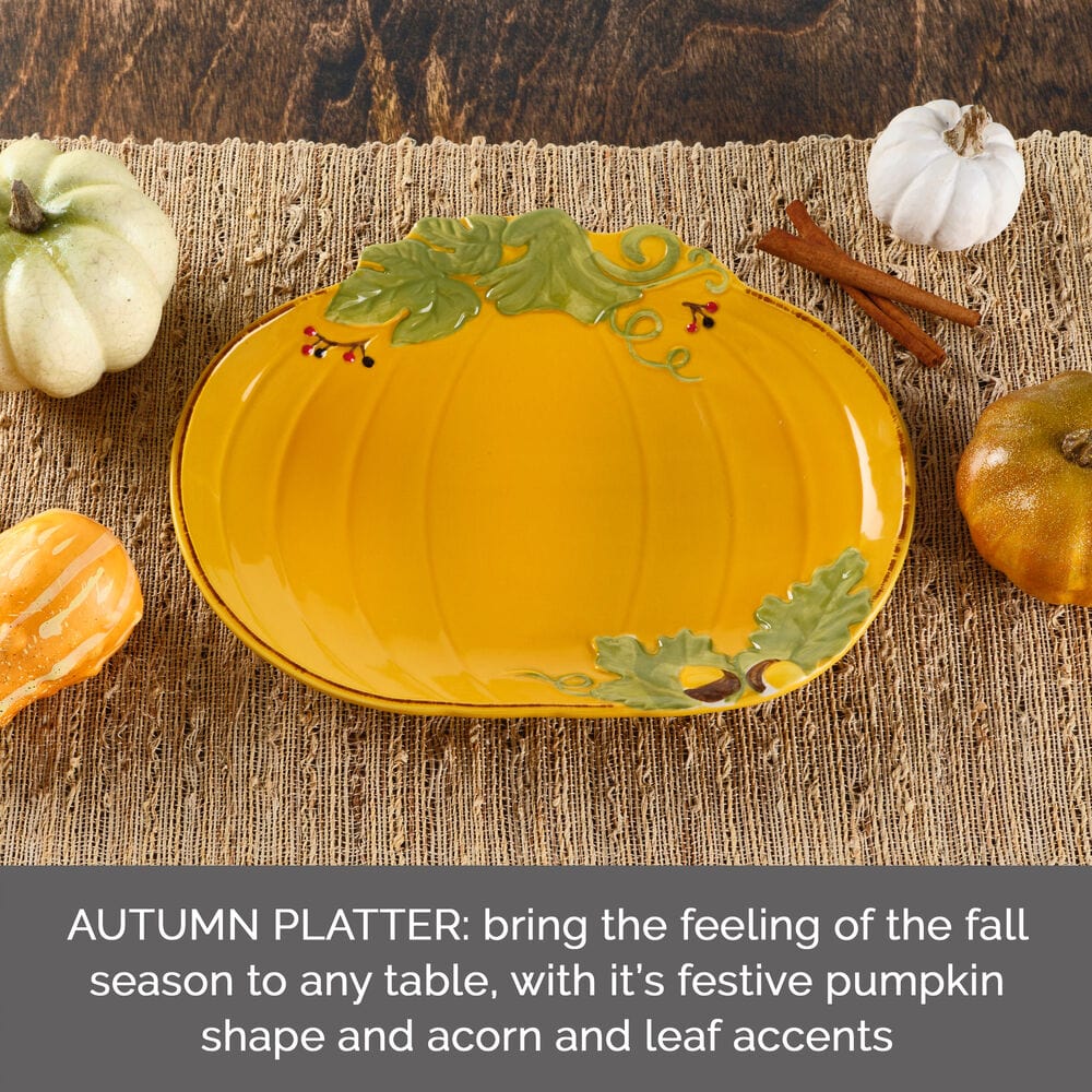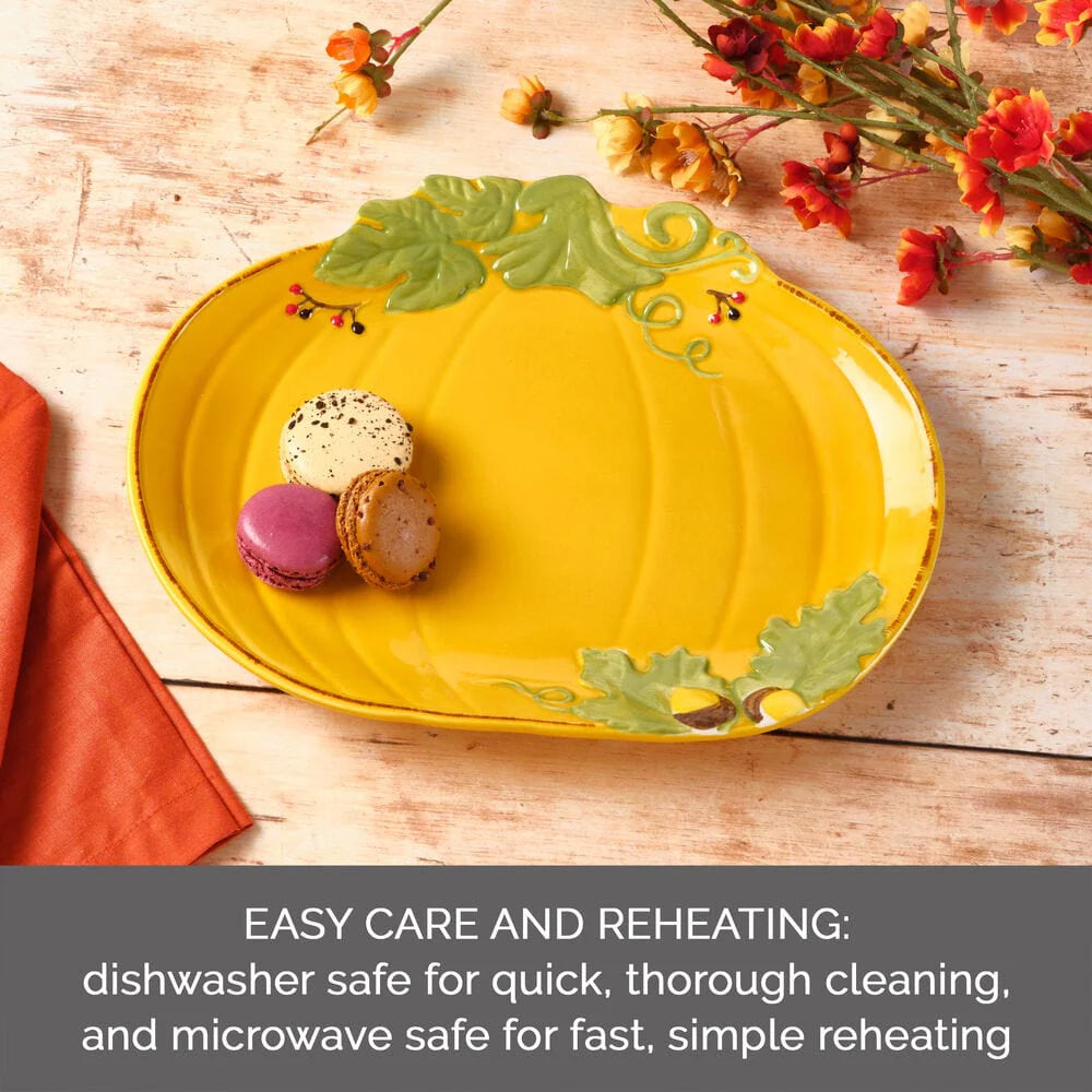 Guaranteed to bring the feeling of the Fall season to any table, this Pumpkin Platter features a festive pumpkin shape with acorn and leaf accents. Great at a buffet or for serving hors d'oeuvres, vegetables, snacks or baked goods. Crafted of stoneware. Microwave and dishwasher safe. Pumpkin platter measures 12 inch long x 9-1/2 inch wide.