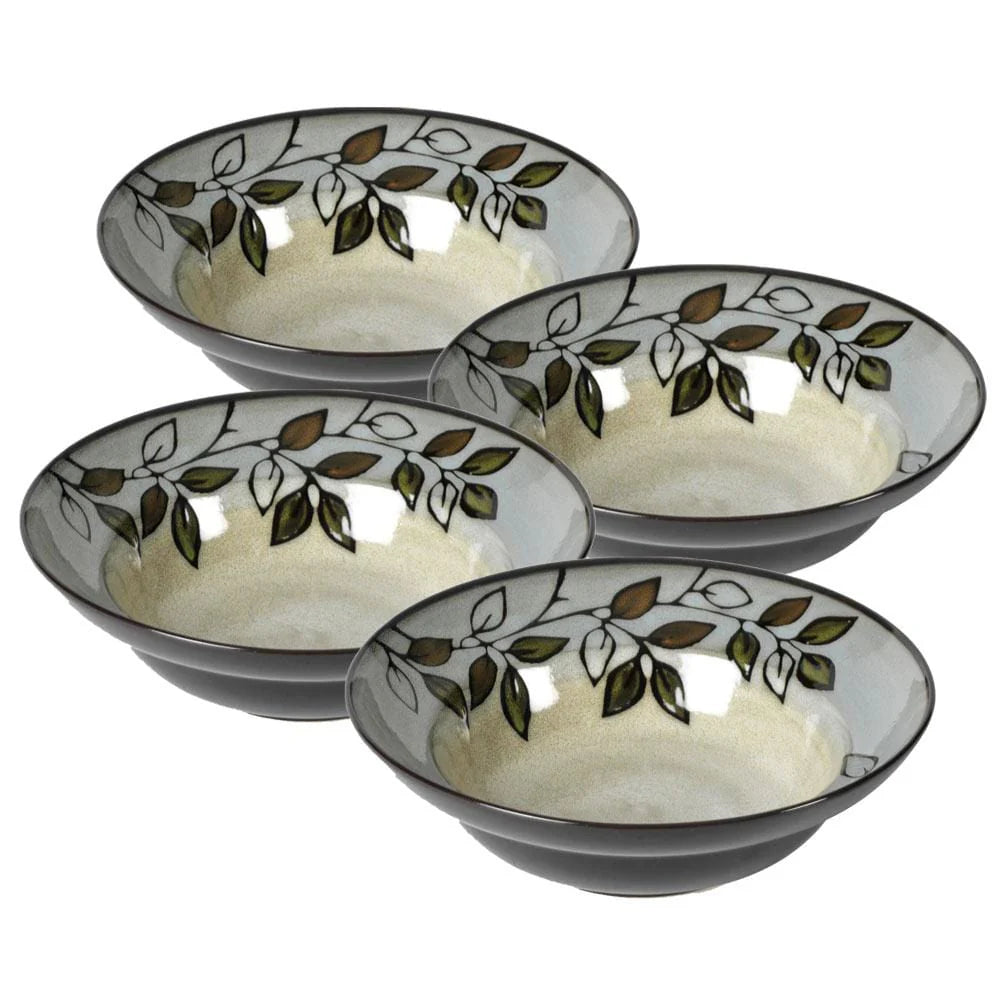This Pfaltzgraff Rustic Leaves Set of 4 Rim Soup Cereal Bowls feature cascading leaves in natural tones of green, gold, and white with a reactive glaze finish. Due to the nature and hand-crafted qualities of reactive glaze, no two pieces are exactly alike and will exhibit unique variations in color and pattern. Product may slightly differ from image shown.