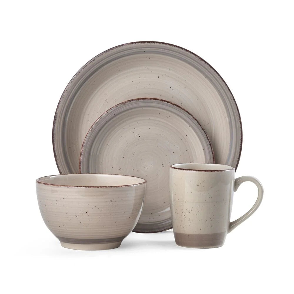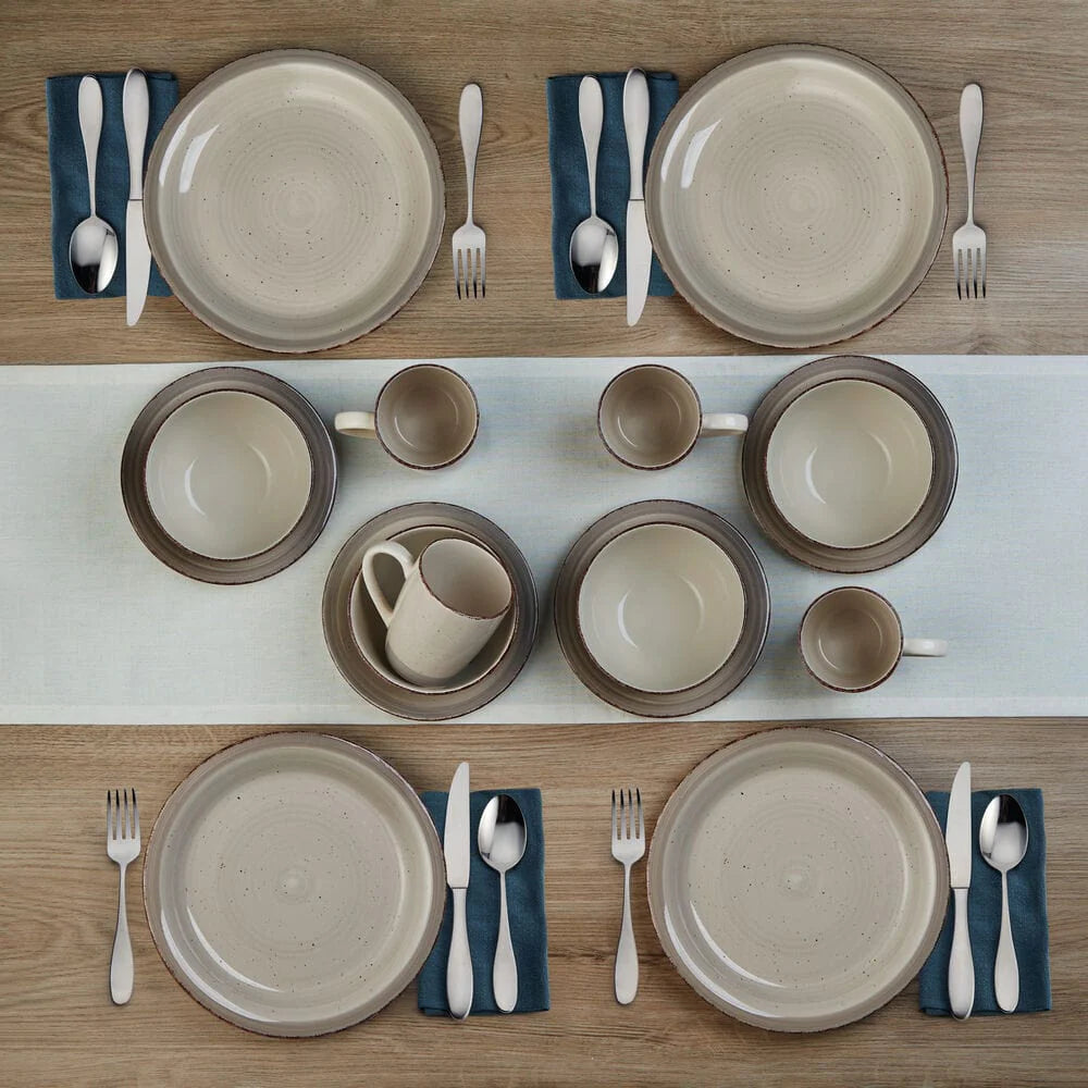 Crafted of high-quality stoneware for strength and durability, this collection is sleek and modern with contemporary round shapes in varying shades of cream that give each piece an organic look and feel. 16-piece set, service for 4, includes 4 each of: 10-1/2 inch dinner plate, 7-1/2 inch salad plate, 5.5-inch cereal bowl 28-fluid ounce capacity, and 12-fluid ounce mug. Microwave and dishwasher safe.
