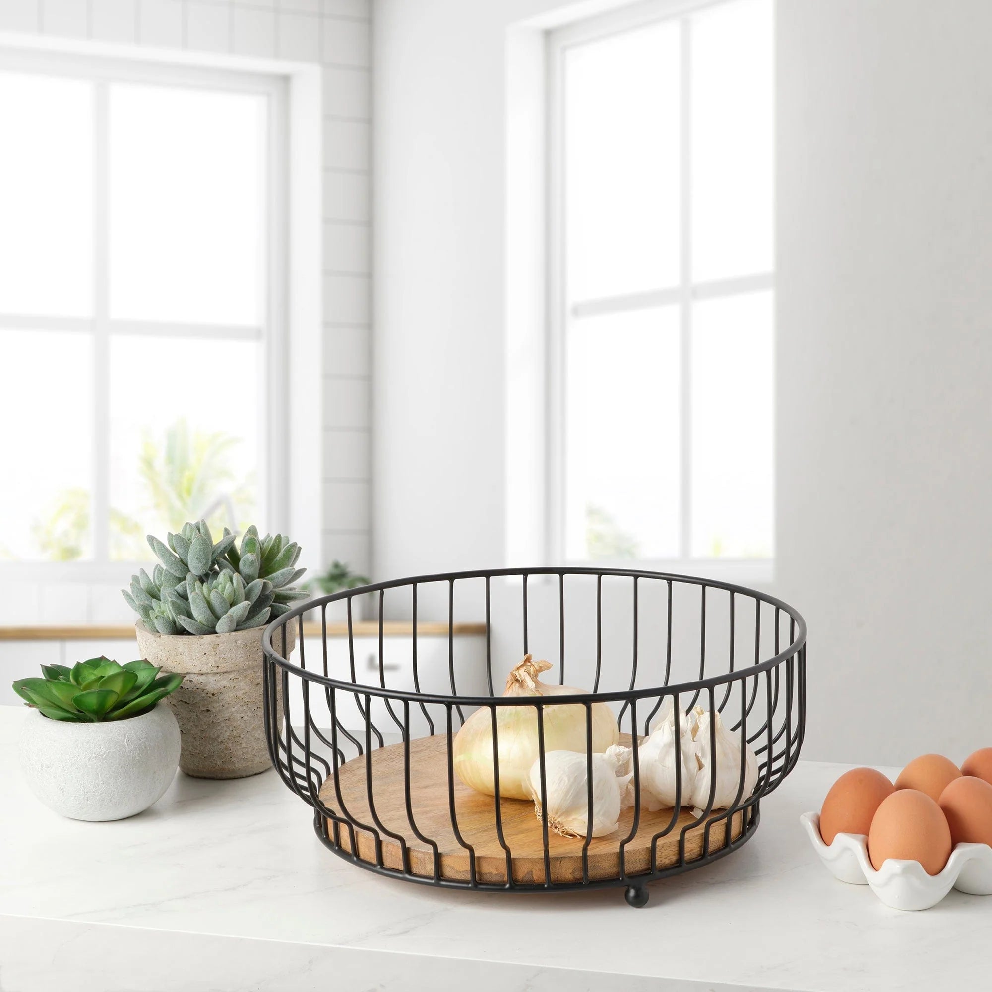 This Savannah Fruit Storage Basket with Banana Hook allows fruit to serve as a decorate accent piece in your kitchen when it is being stored to ripen for consumption. The black, wire-framed structure lets fruit breathe while making it visually appetizing, and features a hook to hang a batch of bananas so they won't bruise and will ripen evenly.