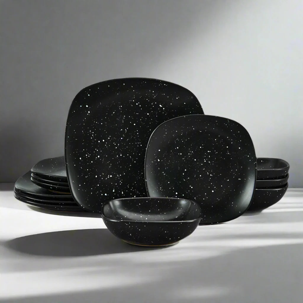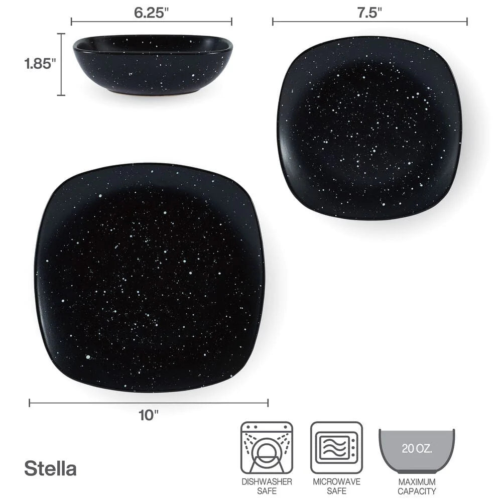 Make every meal a trip to the stars with this Stella 12 Piece Square Dinnerware Set. Contemporary, square-shaped pieces with gently curved corners in bold black have a full-coverage speckled glaze finish that creates a galactic landscape across the surface of your tabletop.