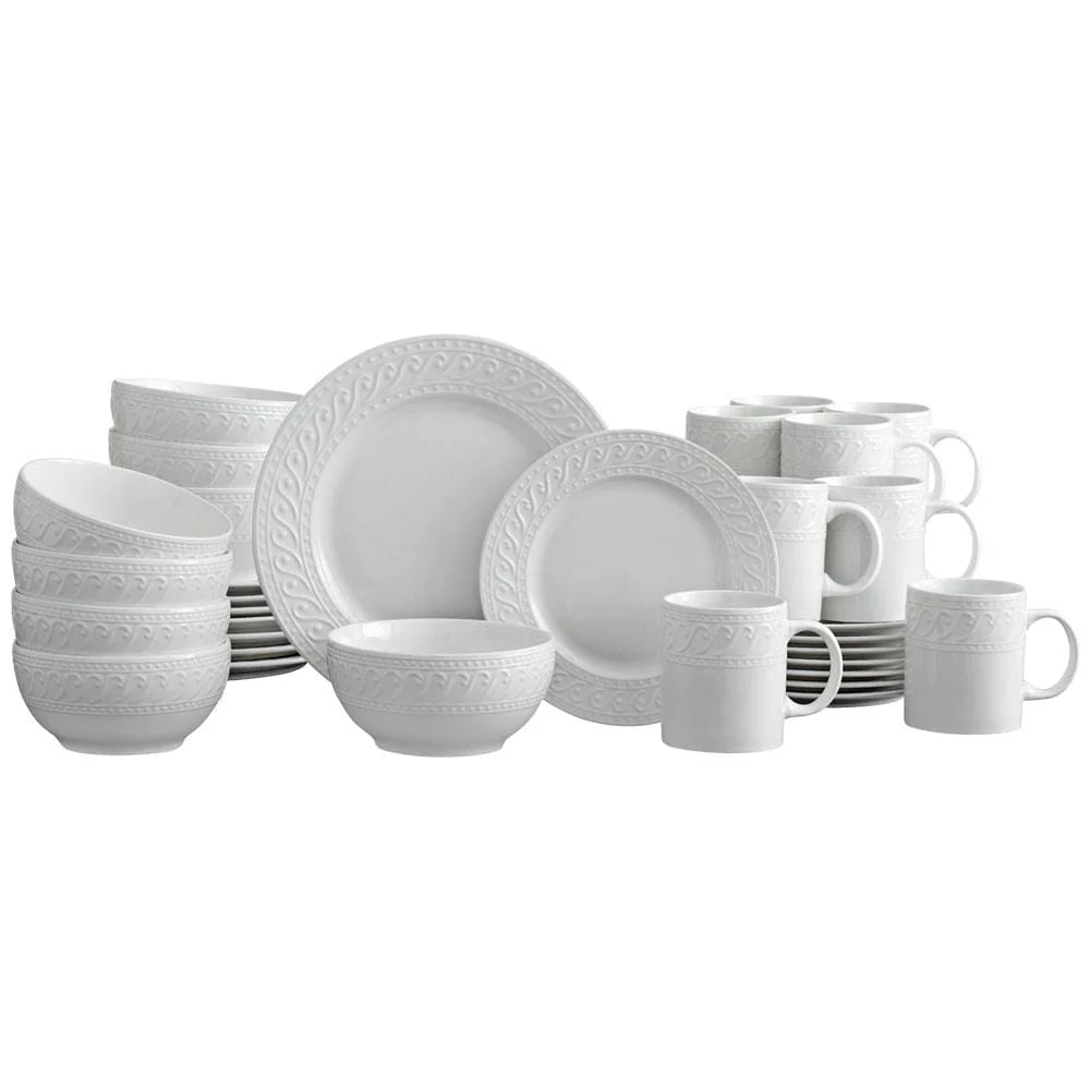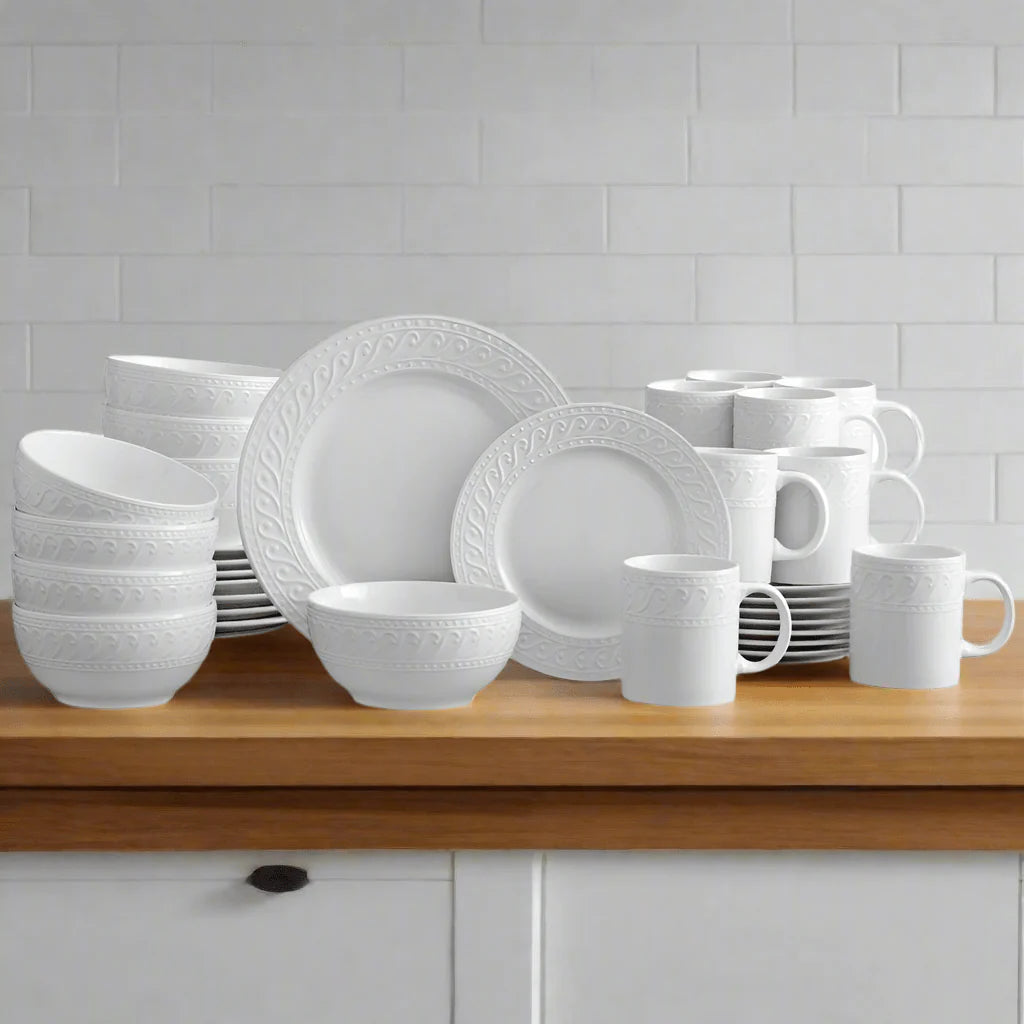 Serve up style with the Sylvia 32 Piece Dinnerware Set with a traditional, scroll and beaded design, this set crafted of porcelain is both elegant and durable for everyday use. Perfect for entertaining or enjoying a meal with the family.