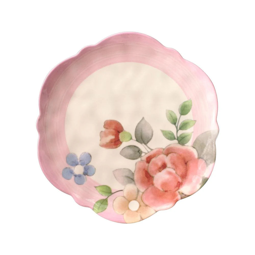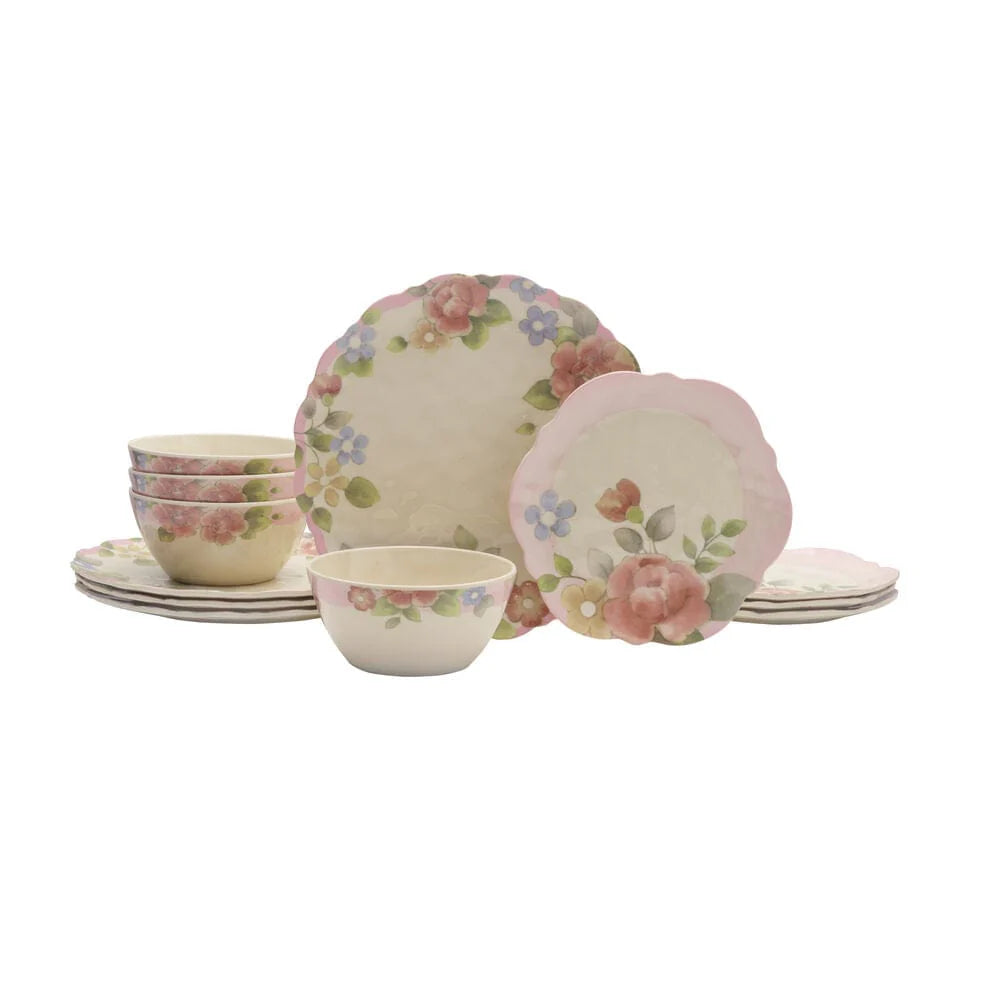 This Tea Rose Melamine Dinnerware Set showcases timeless charm. With its signature scalloped edges and delicate watercolor roses, this pattern has been a bestseller since 1985.
