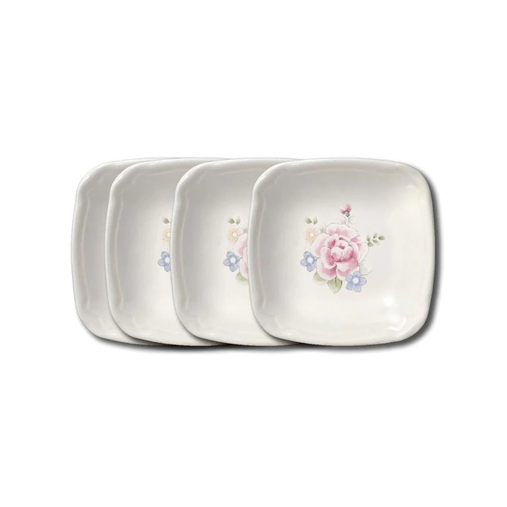 These little dishes are perfect for hor d'ouevres, snacks or late night treats. Crafted of stoneware. Microwave and dishwasher safe. Set of 4 appetizer plates, each measures 5 inch square.