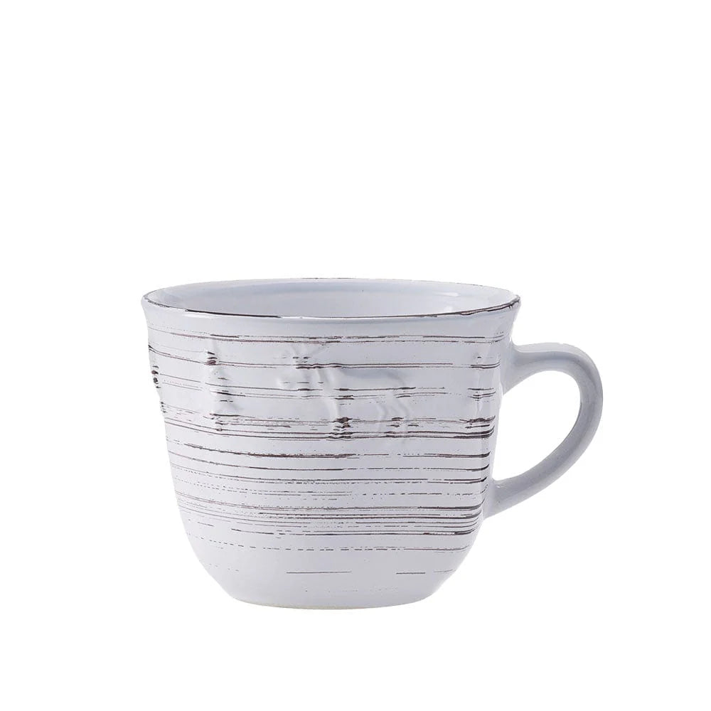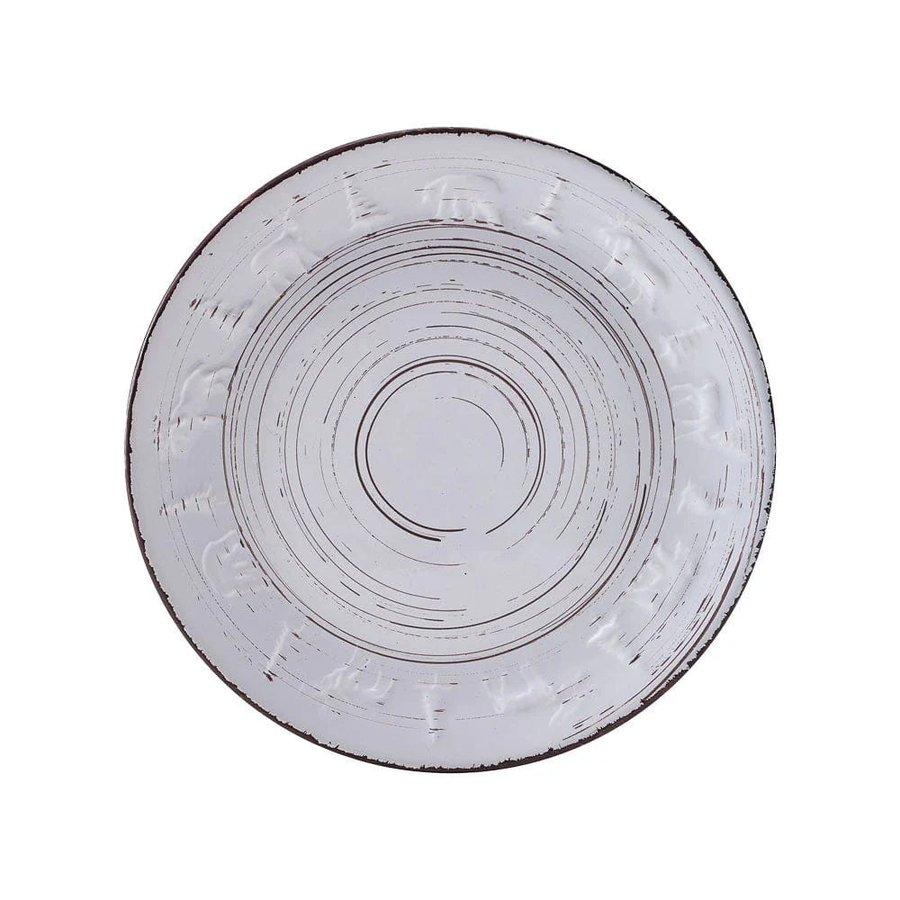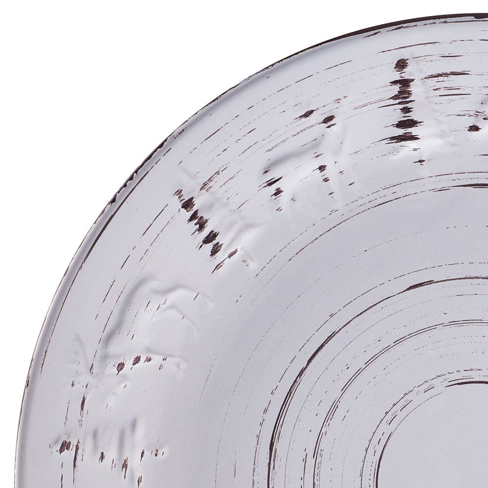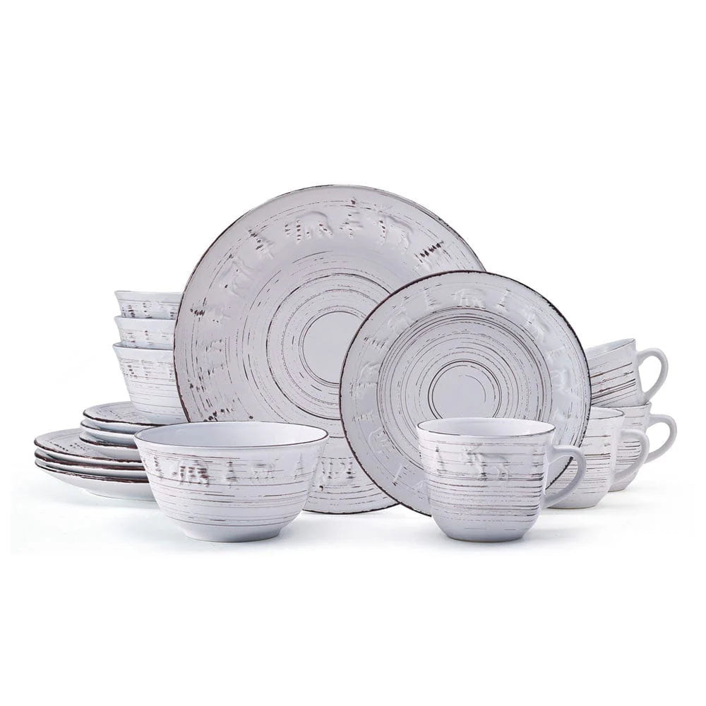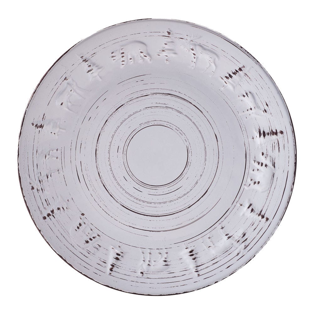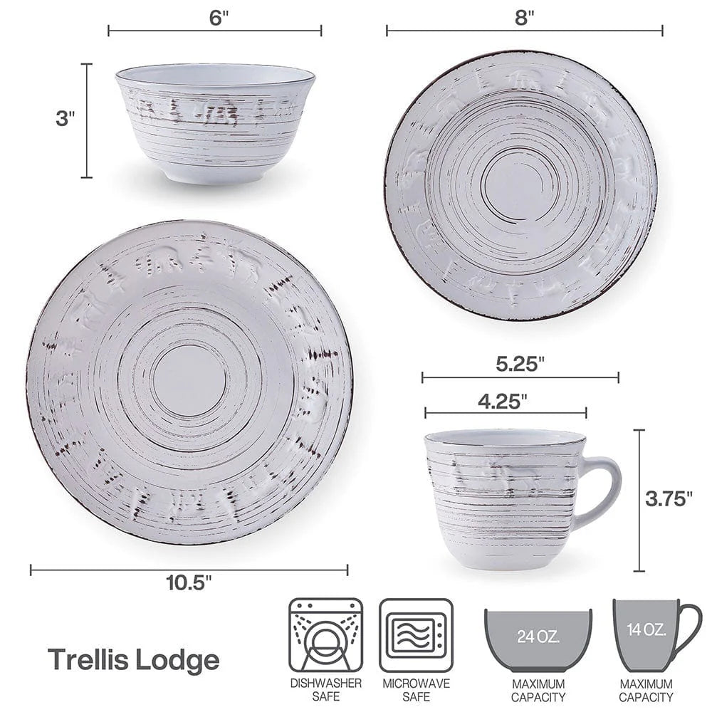 This Trellis Lodge White Dinnerware Set features dark striations swirling around each piece, giving this collection the weathered look of rustic elements in a summer garden, with subtle, embossed pine trees and animal designs around the rims completing the look.