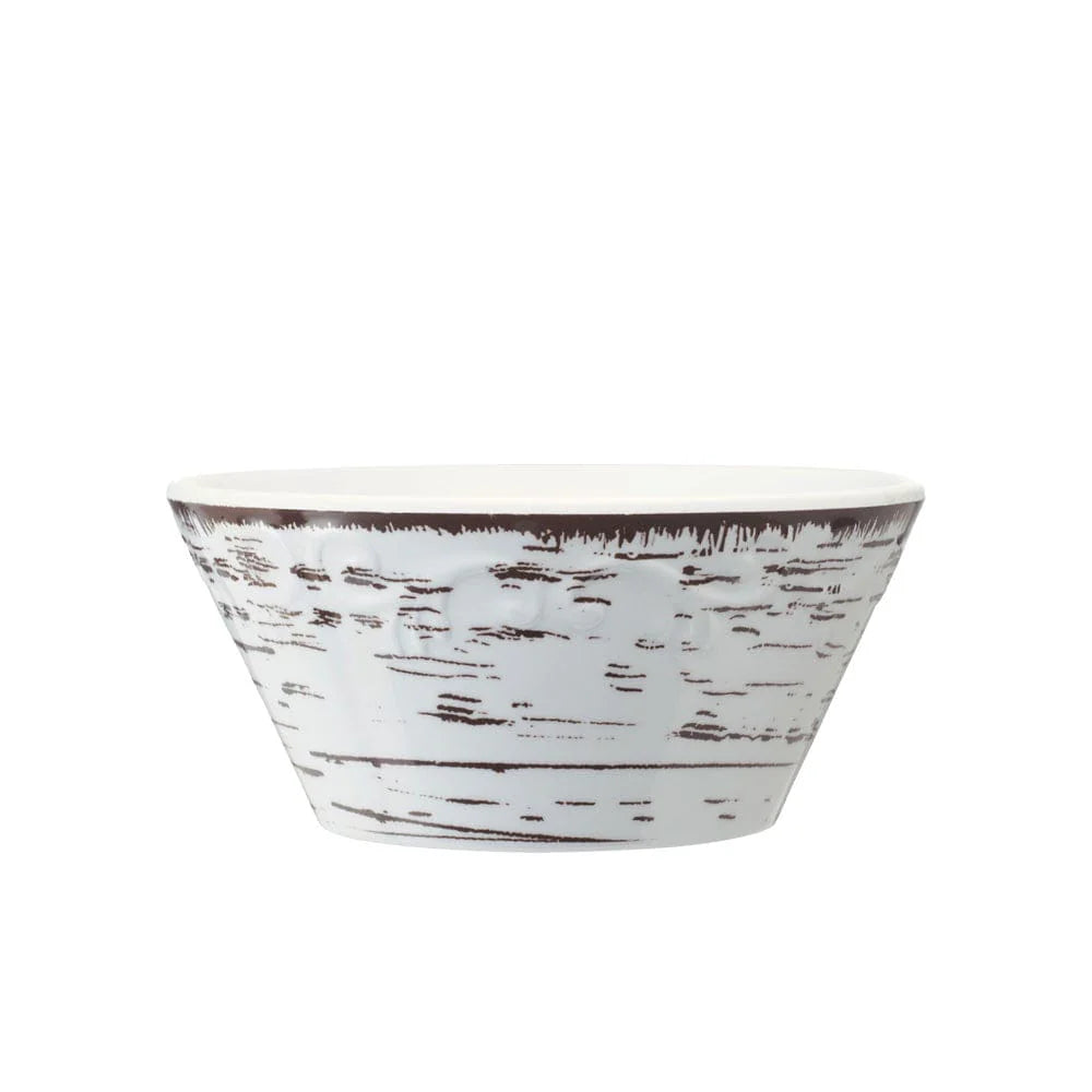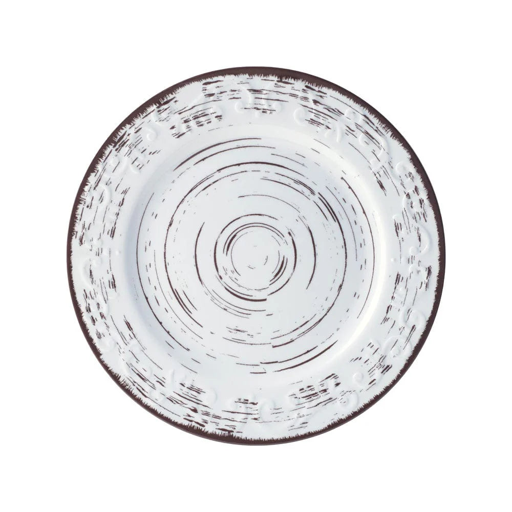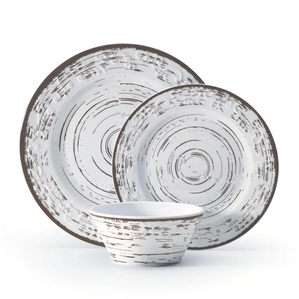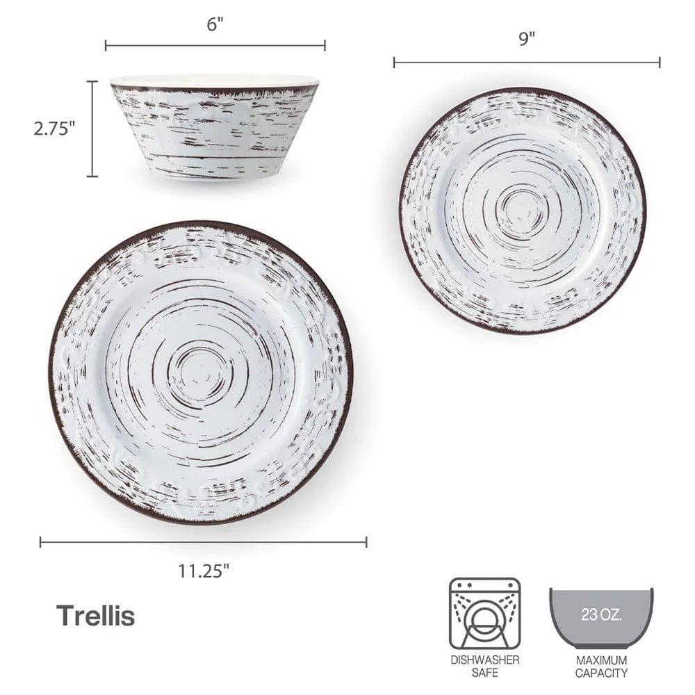 This Trellis White Melamine Dinnerware Set features a subtle scroll pattern, accented by dark striations that give it the appearance of being weathered by the elements, and you won't have to worry about it breaking, melamine is hardworking, durable and virtually indestructible, making it a natural for entertaining, especially outdoors.