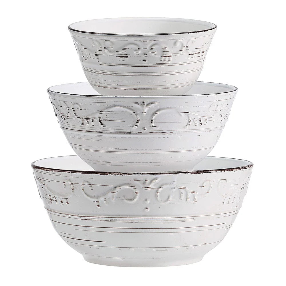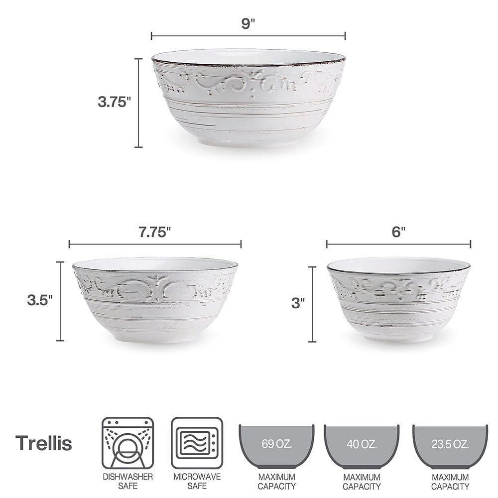 This Trellis White Set of 3 Serving Bowls feature a subtle scroll pattern and dark striations that give them the appearance of being weathered by the elements, and will make a great addition to your table setting. Set includes a variety of sizes to best suit your needs, these durable bowls are ideal serving a delicious array of dishes to accompany your entree.