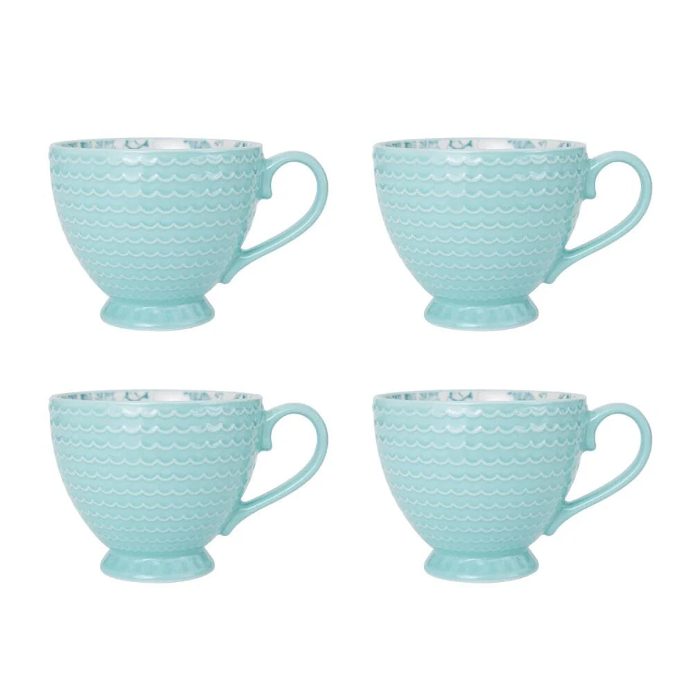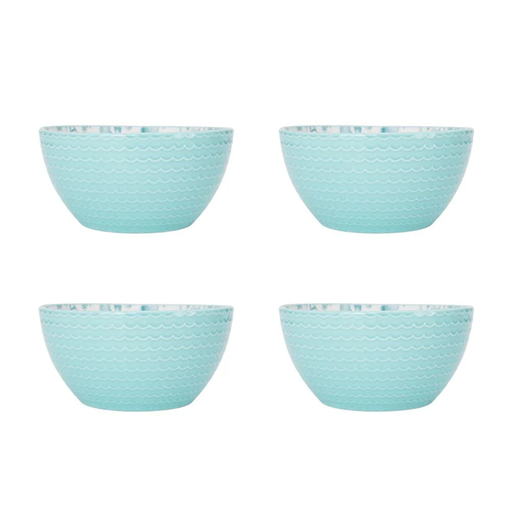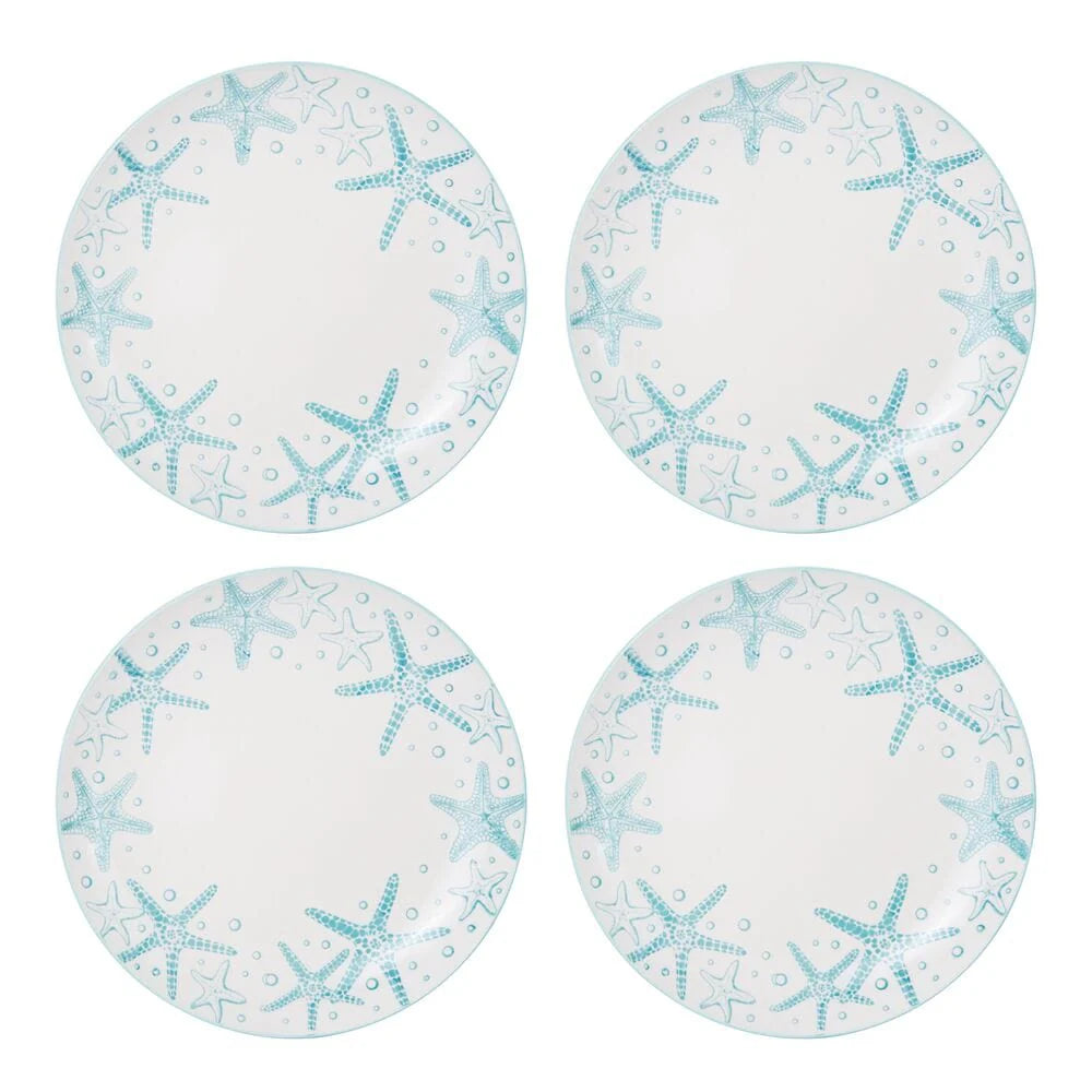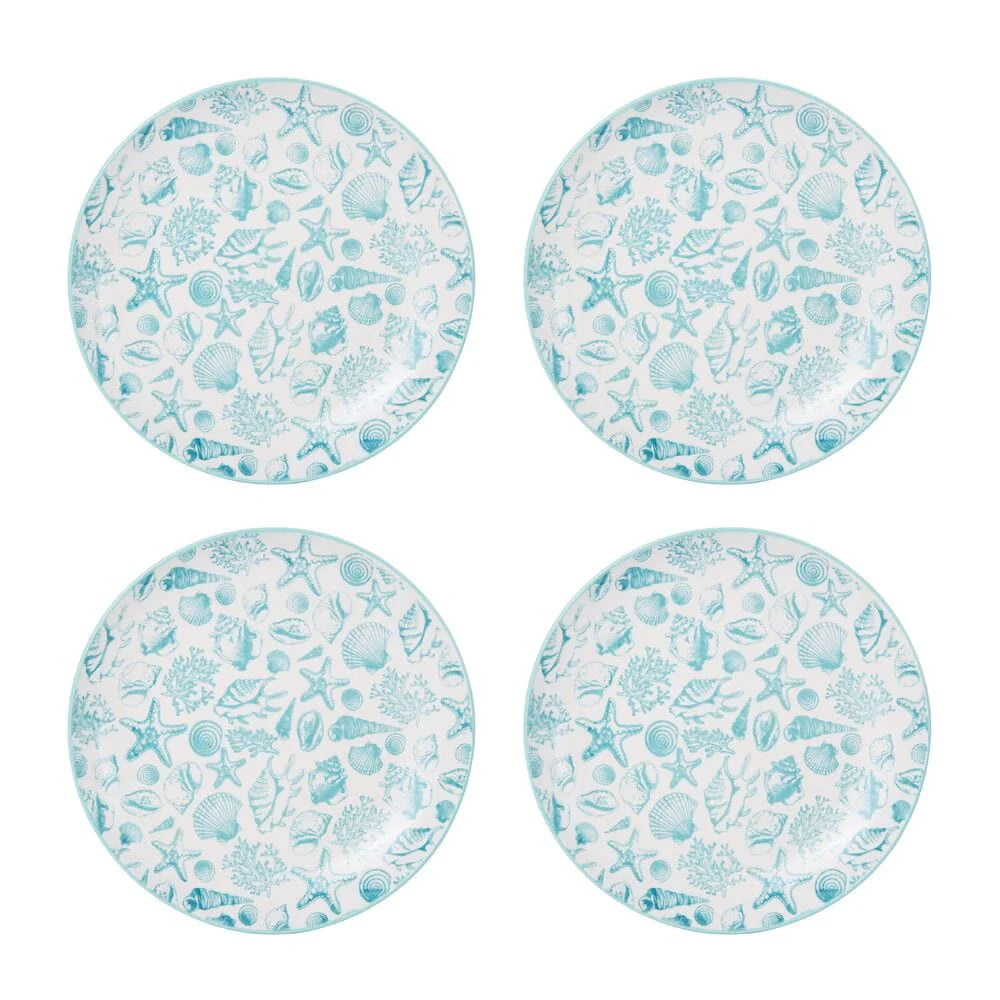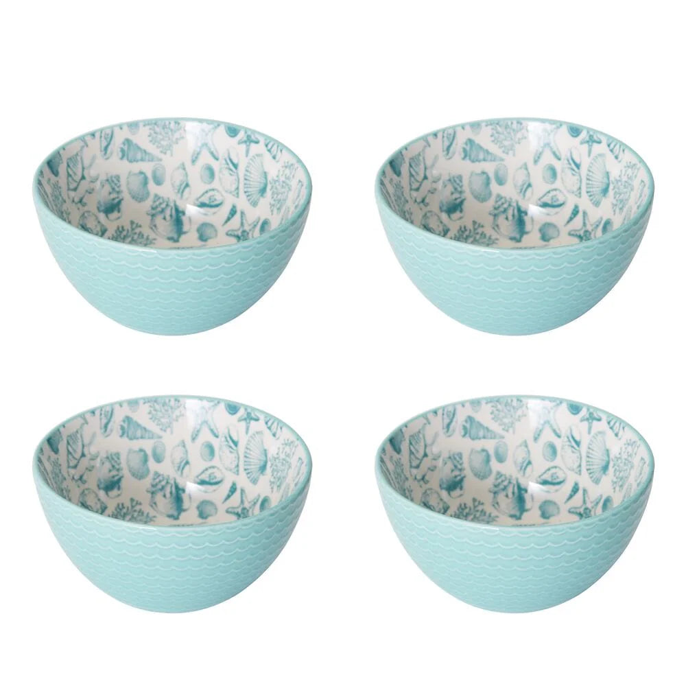 A whimsical starfish and seashell pattern splashes across the surface of this high-quality stoneware. The bright teal exterior enhances the coastal theme and completes the look of this collection.