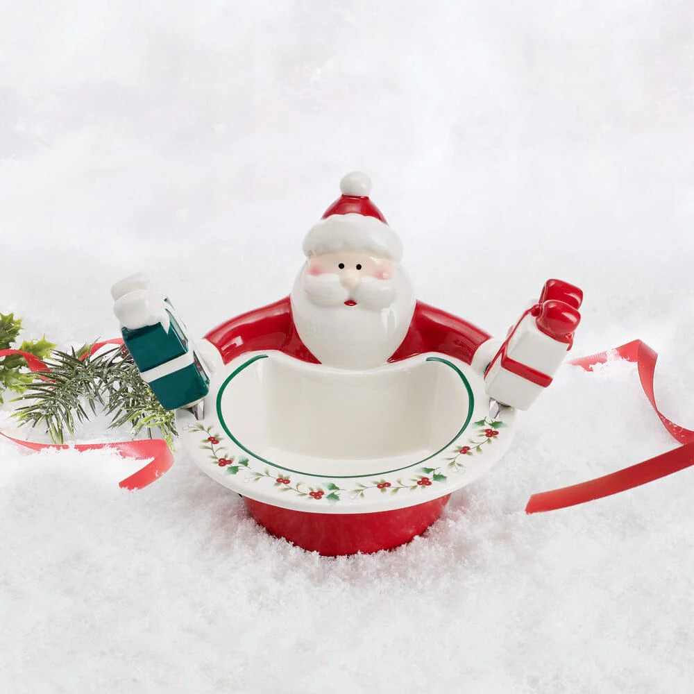 This Winterberry Santa Dip Bowl with Gift Spreaders features an adorable Santa figurine accent and the festive Winterberry pattern around the rim.. This set will add a festive touch to your table all season long.
