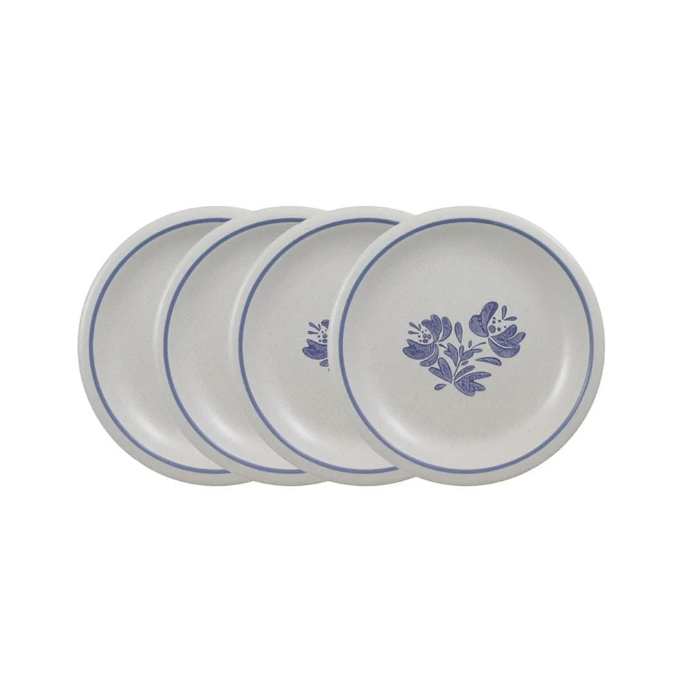 A great size to use for hors d'oeuvres. Constructed of stoneware. Microwave and dishwasher safe. Set of 4 bread and butter or dessert plates, each measures 6-3/8 inch diameter.